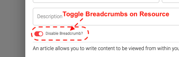 By default, your resources will have a breadcrumb at the top which will allow your users to see how they navigated to this resource and to be able to return to a previous view. However, this may not be intuitive or appropriate for your resources. One of the easiest ways to customize your user’s navigation experience is to disable this. You can do this by simply opening the resource within the Devless Admin, and switching off the “Breadcrumb” option: