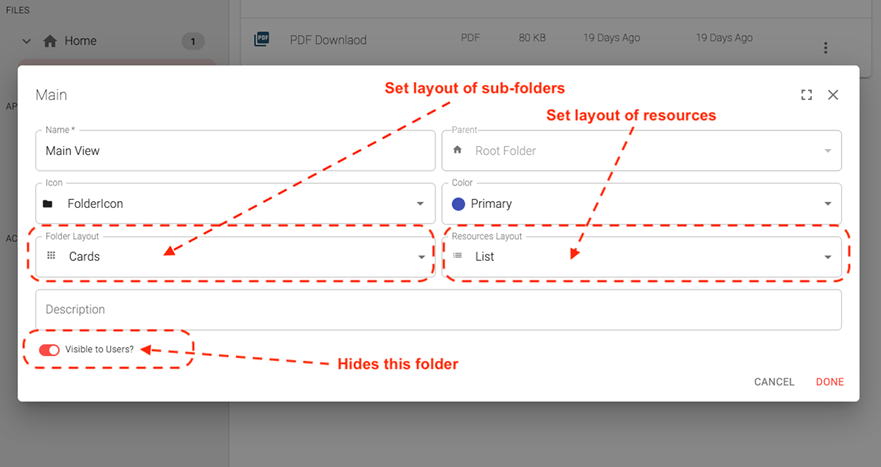 First, you can choose how any sub-folder or resources will be displayed when the user views this folder. For both, our options are:
