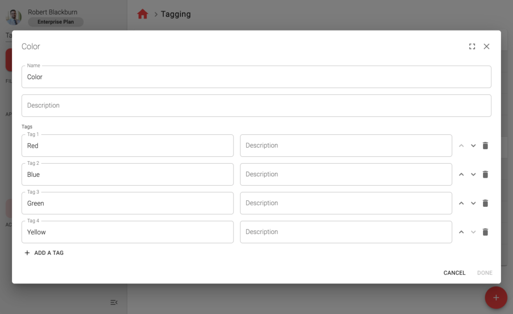You can now give your Tag Category a name (i.e. “Color”). You can also add one or more tags to the category by clicking “Add A Tag”.