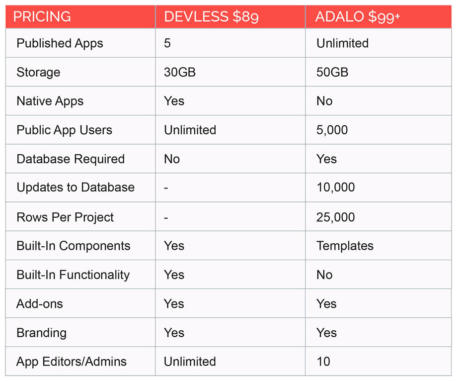 Start creating apps for free to test out each app builder’s features and decide which one is the best fit for your needs. Both Devless and Glide offer users the ability to quickly publish applications, but when we look at the paid plans there are some key differences. Devless offers you native apps in the app stores along with unlimited public app users and editors. Remember, no database management is required! Unlike Glide, Devless’s built-in components and functionality allow you to fast-track app development with ease. Give it a try today!